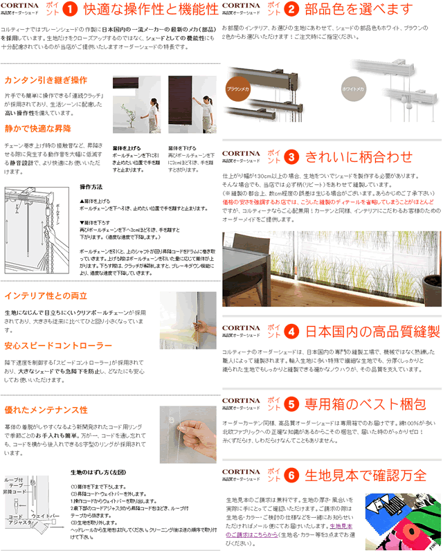 このページでは「ご希望の生地」「取付方法」「操作位置」「部品色」の3点をお選びの上ご注文フォームにお進みいただき、専用の記入欄(備考欄)に「仕上がりサイズ」をご記載の上ご注文ください。