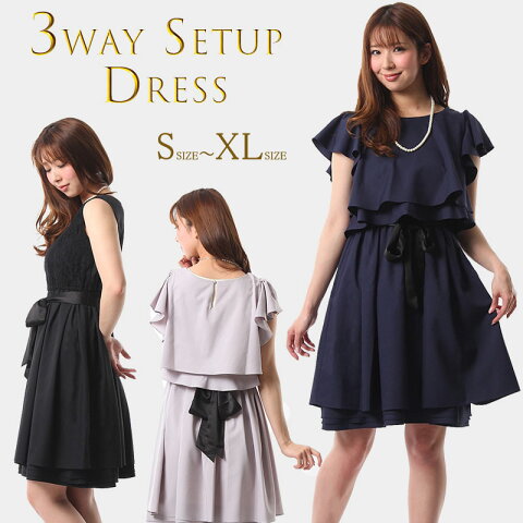 ドレス 二次会 【3WAYで着れる、ブラウスとノースリーブワンピースのセットアップドレス】パーティードレス 大きいサイズ ワンピース 結婚式ドレス 結婚式 二次会 レース プルオーバー リボン ベルト SSS