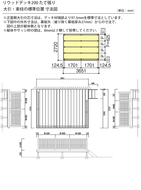 商 品 詳 細 寸 法 【デッキ】間口2間(W)3651mm×奥行9尺(D)2720mm 束柱タイプ:Tタイプ 高さ(H)400〜550mm 【ステップ】ステップ5型 Sタイプ 標準2段仕様 ※側板下部を切詰めて高さ調整が可能です。