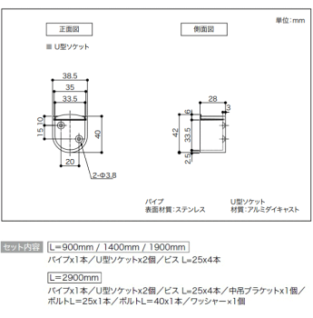 セット内容 パイプ×1本/U型ソケット×2個/ビスL=25×4本 アートランバーOタイプパイプセットC(U型) パイプはステンレス巻き仕上げ、美しくリーズナブルにご使用いただけます。