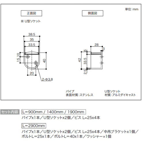 寸法 入数 品番 φ32 L=900 1セット HPC-U32-900 φ32 L=1400 HPC-U32-1400 φ32 L=1900 HPC-U32-1900 φ32 L=2900 HPC-U32-2900 パイプセットC(U型) 商品一覧 パイプセットC(U型) U型ソケット 中吊ブラケット (パイプセットC用) ↓ご注文はコチラから